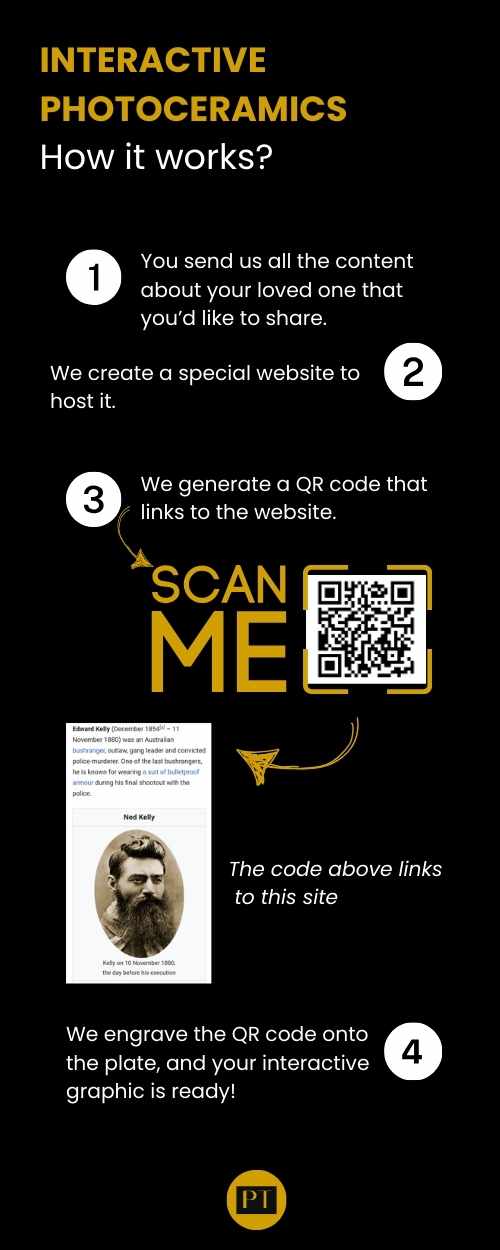 The total cost for preparing the webpage and converting it to a QR code is $450 AUD. The cost of firing the code onto a ceramic plate follows our attached price list, depending on the plate’s shape and size. If the QR code is placed on the same plate as an ordered photograph of the person, there will be no additional charge for adding the code.
